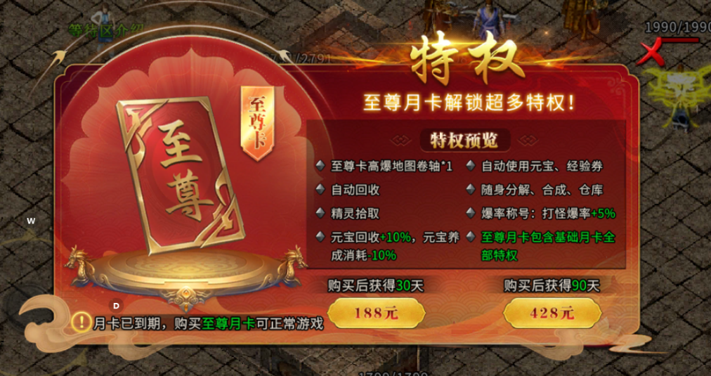 点卡机制纯复古,三档特权提便利。游戏坚守纯粹的点卡计时核心,延续经典点卡设定,推出三档适配不同玩家的点卡套餐,均不涉及任何战力加成,全力保障所有玩家公平竞技,点卡仅可通过充值获取,无任何游戏内玩法产出渠道。基础日卡主打新手适配,解锁自动拾取与自动回收功能,无需手动筛选道具、整理背包,避免因背包满载中断打宝节奏,自动使用经验道具,实现在线离线稳步成长;进阶月卡在日卡基础上,优化资源获取效率,让玩家在相同点卡时长内,收获更多养成材料,适配长期稳定体验;至尊月卡解锁全量便利特权,新增随身分解仓库,冗余装备可即时分解转化为强化材料,省去往返主城跑图的繁琐,额外叠加小幅爆率优化,让每一分钟充值的点卡时长都发挥最大价值,兼顾效率与纯粹。